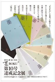 同人誌「墨BOKU」は2021年6月に創刊、以後、年2回刊行。 脱「活字文化」を掲げて手書きの俳句と、 モノクロームを基調とする多岐にわたるジャンルの作品を掲載。 俳句誌としては稀なる体裁でありながら、今回第10号を達成した。 俳句を通して集まった仲間。ゆえに、展示作品のかたわら、 誌面を飾った手書きの俳句1句も紹介する。 書き手の気合や個性、息遣いをも じかに感じ取っていただけたらと切に願う。 |
